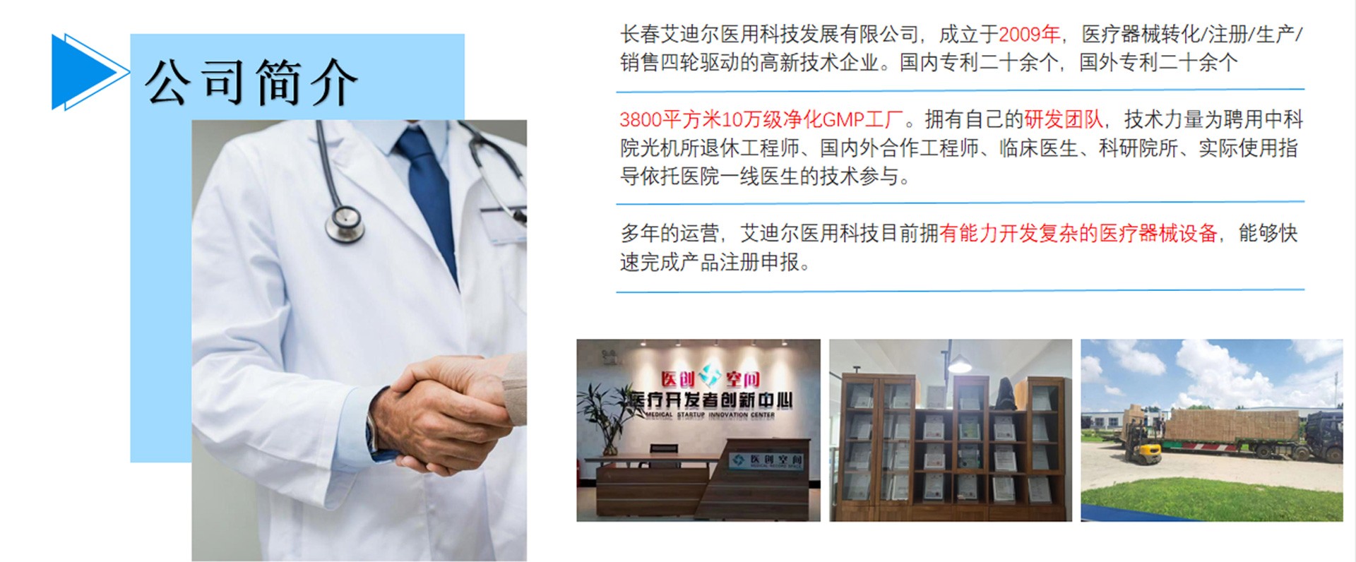 長春艾迪爾醫(yī)用科技發(fā)展有限公司為集產(chǎn)(自有工廠); 學(多所院校科研課題合作單位);研(研發(fā)成果轉(zhuǎn)化注冊)三位一體的高新技術(shù)企業(yè)。艾迪爾科技主要經(jīng)營范圍為一次性醫(yī)療器械耗材的開發(fā),專注于抗菌肽新材料的開發(fā)和研制,以“IN-58抗菌肽一類新藥及原料藥注冊、激光類治療儀”兩個核心優(yōu)勢技術(shù)為中心。公司擁有標準GMP車間及健全的質(zhì)量管理體系,擁有多個已上市和即將上市的產(chǎn)品,包括睡眠、泌尿、口腔、肝膽、消殺、婦科六大系列產(chǎn)品線。公司擁有核心專業(yè)技術(shù)報批團隊,承接國內(nèi)外醫(yī)療器械專項成果轉(zhuǎn)化,具備自主研發(fā)能力及MAH服務能力。
